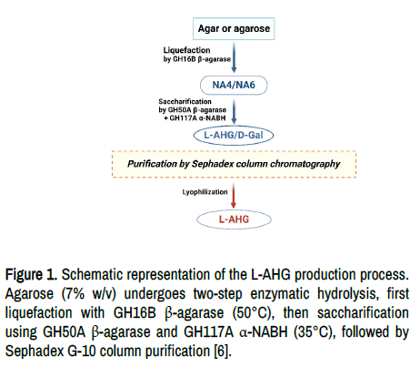 Figure 1. Schematic representation of the L-AHG production process. Agarose (7% w/v) undergoes two-step enzymatic hydrolysis, first liquefaction with GH16B β-agarase (50°C), then saccharification using GH50A β-agarase and GH117A α-NABH (35°C), followed by Sephadex G-10 column purification [6].