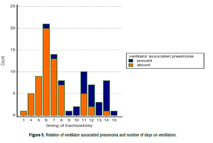 In this study, the incidence of VAP kept on increasing with 40% of the patients developing VAP within 12 days and 64% of patients who required PMV developing VAP up to 3 weeks, but 7.1% of the patients developed VAP when tracheostomy was performed within 8 days. In majority two trials of extubation were given postoperatively at 48 hrs interval following which tracheostomy was planned with the consent of relatives is shown in Figure 5.
