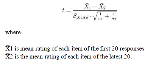Responses are an estimator of the common standard deviation of the first and latest samples. In addition, N is the number of valid responses of the first 20 responses and n2 is the number of valid responses of the latest 20 responses. The mean ratings of each item of the first 20 responses and latest 20 responses were not statistically different at 0.05 level. This implied that the first 20 responses and latest 20 responses were similar and did not show any systematic differences that might cause any major concerns or red flags [7].