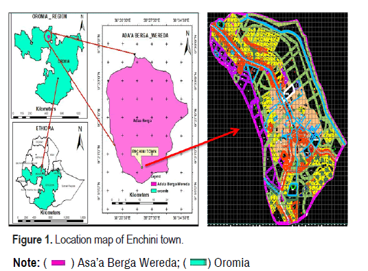 Enchini town is situated in West Shoa Zone of Oromia National Regional State and capital town of Ada’a Berga Wereda. The town is reached via the main high way of Addis Ababa -Mugar. Geographically, the study area extends from 9015’0” N to 9039’0” N and 38020’30” E to 38034’30” E. According to the CSA estimated report in 2018 the total population of the town is about 11,443 (Figure 1).