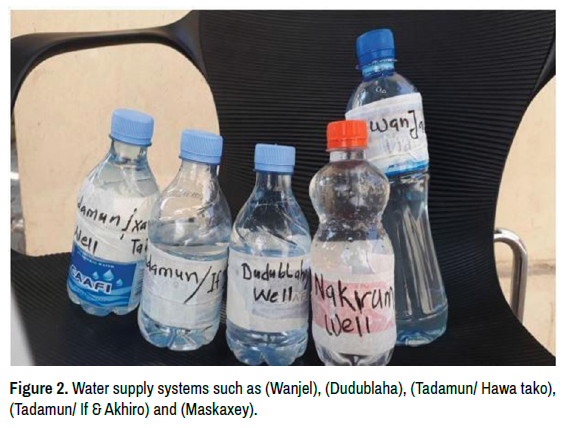 For all water supply systems such as (Wanjel), (Dudublaha), (Tadamun/ Hawa tako), (Tadamun/ If & Akhiro) and (Maskaxey) water samples were collected from the source of the water supply systems, in the distribution system and at the consumer point. Samples were also collected on the sterilized bottles provided by the laboratory. One sample was taken from each water supply systems (Figure 2).