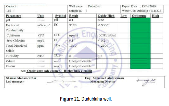 To insure that the safety of the water for human domestic uses the researcher took Samples from the water sources of the study area and were analyzed from bacterial contamination (total coli form), physiochemical parameters (PH, turbidity, electrical conductivity, total dissolved solids, smell, and color) in the Mumtaz engineering & general services company laboratory in Mogadishu (Figure 19-23).
