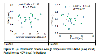 The results based on equation 2 and 3 are shown in Figure 11. For Allahabad, this model did fairly well. However, for Ludhiana, the performance was not that good. Similarly, for Haridwar, the scatter was evident along two lines. From Figure 11, it is apparent that NDVI worked well for certain