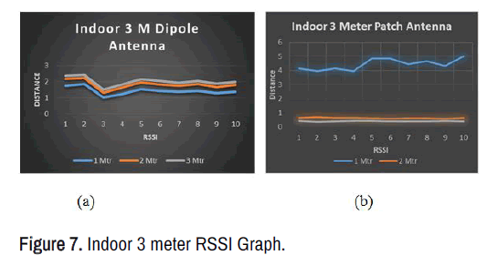 Figure 6 shows the graphs for an indoor experiment in which first we put the evaluation board and sensor 1 feet away from the transmitter and then 5 feet away. Figure 7 shows the graph for indoor dipole antenna RSSI and 3b shows the graph for indoor patch antenna.